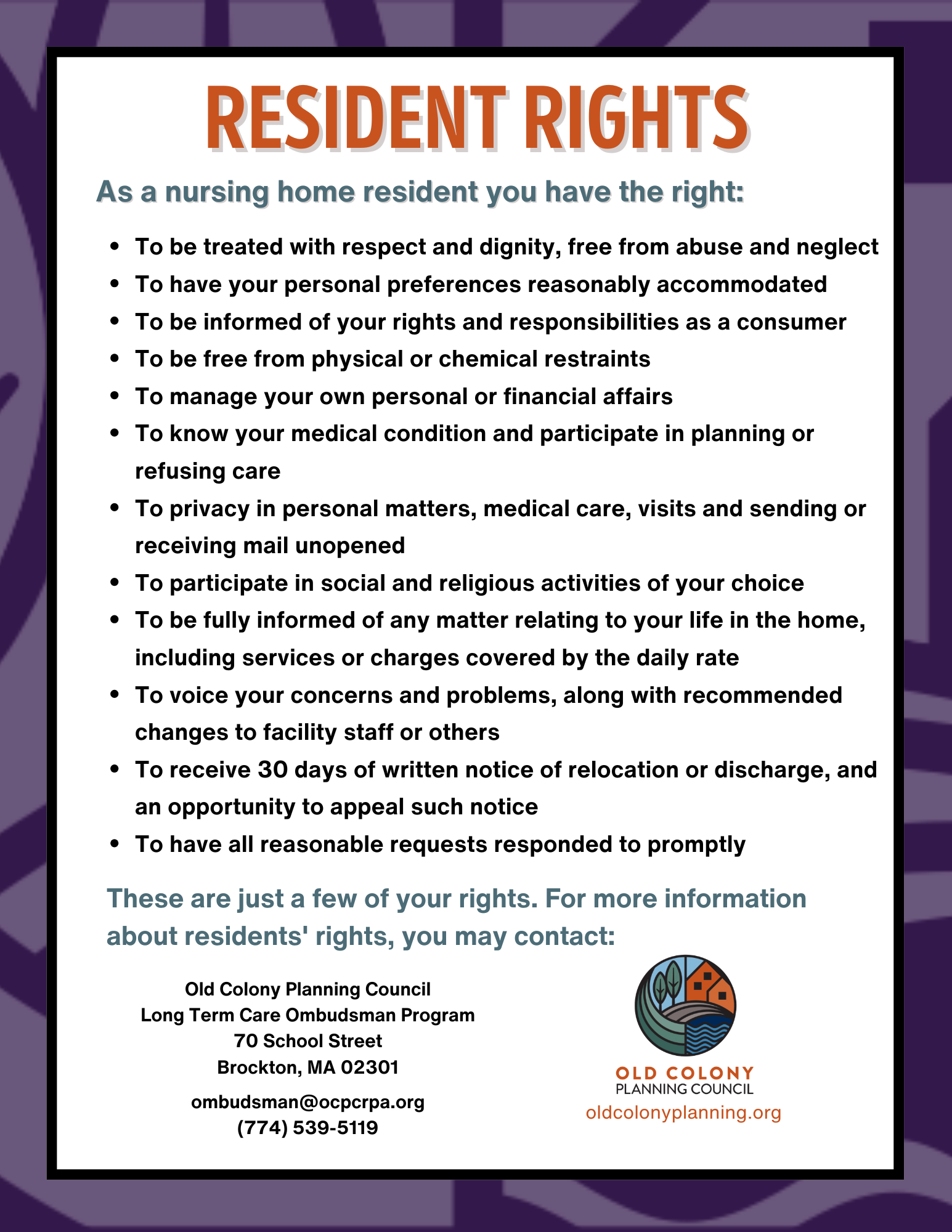 The Program seeks to protect the rights of residents of LTC and Assisted Living facilities, advocates for positive changes to the long-term care system in the state, and provides general information about LTC issues. The Program staff and volunteers are trained and certified by the Massachusetts Executive Office of Elder Affairs. They conduct regular visits to approximately 30 LTC homes and 60 Assisted Living residences in our region. Included in the program is in-service trainings to facility staff on a regular basis.