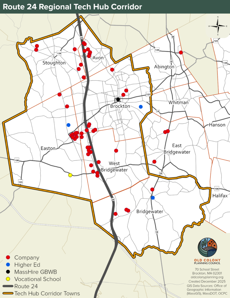 The Old Colony Planning Council (OCPC) is leading a transformative initiative to position the Route 24 corridor as a regional center for advanced manufacturing and technology. This effort is part of the Massachusetts Technology Collaborative’s Tech Hub Grant Program, which supports regional strategies to strengthen innovation ecosystems. Through this program, OCPC will work with businesses, educators, and municipalities to build a competitive innovation economy for Southeastern Massachusetts.