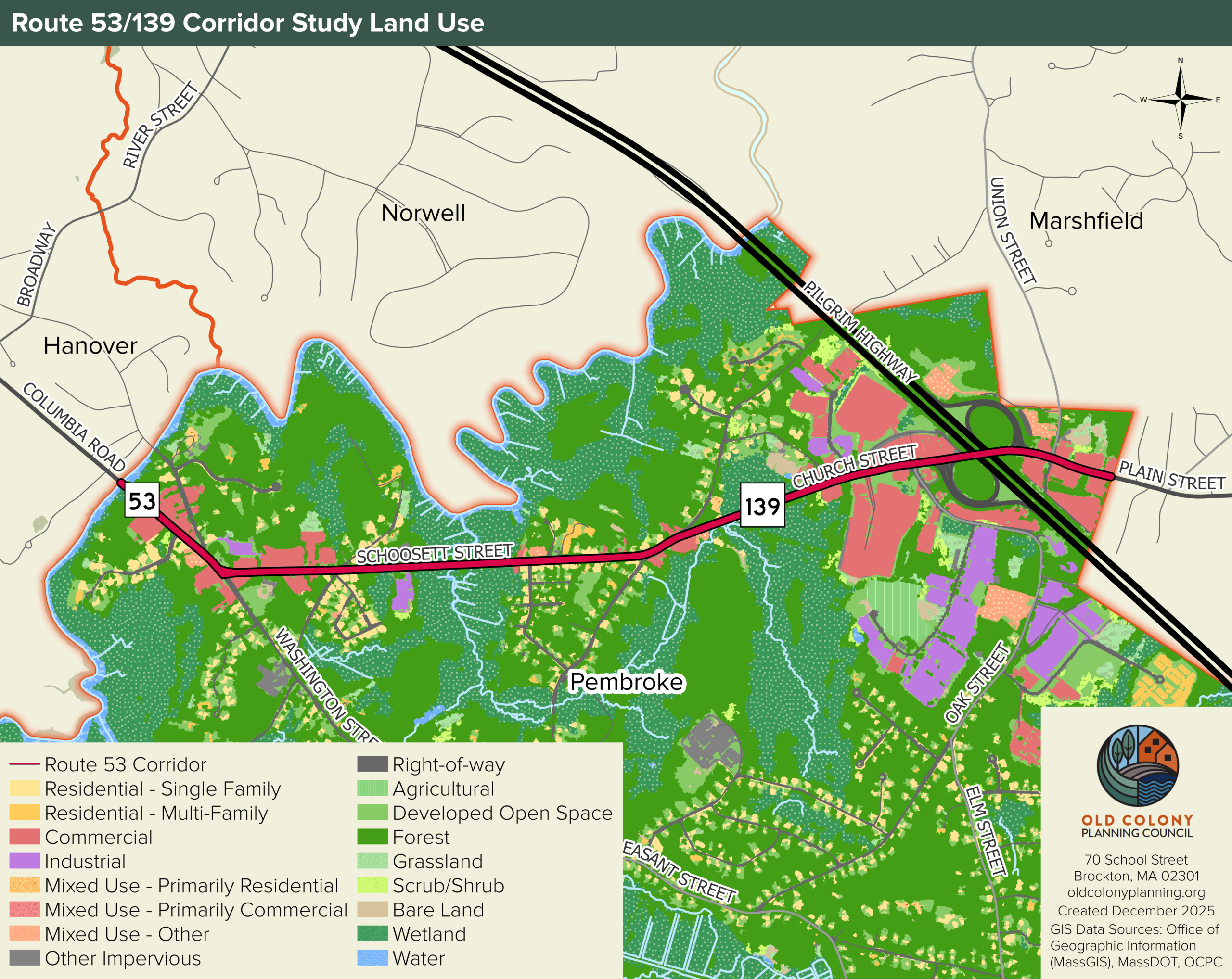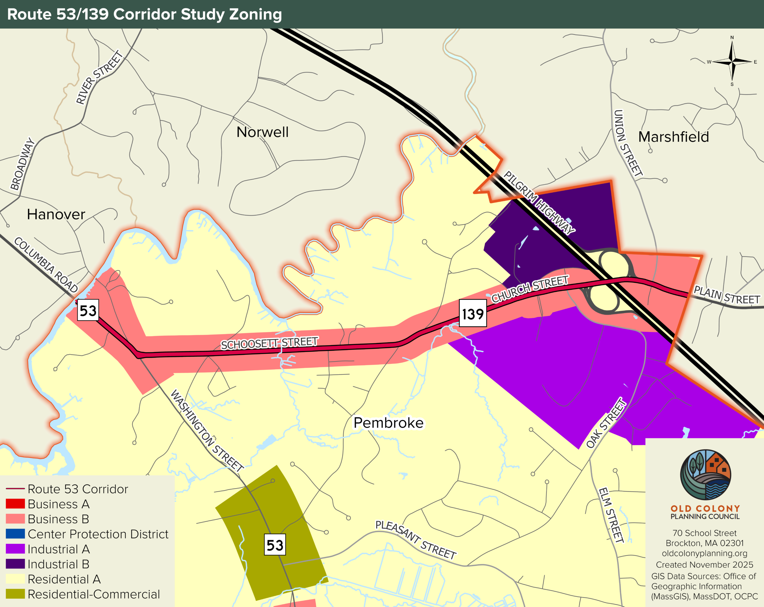 The corridor study area includes Route 53/139 from the Hanover Town Line to Route 139 at the Marshfield Town Line (approximately 2.5 miles). Staff will review volume to capacity ratios, levels-of-service, crash analyses, bus routes and transit access and include public participation as part of the process. The Route 53/139 Corridor Study will align with industry standards based on Federal and State guidelines and practices, with the consideration of local ordinance and statutes. The study will determine system needs and identify operational deficiencies and will coordinate improvements that support regional objectives, adjacent land use, and future land use development. The study will consolidate and formalize driveway access, improve intersection design, improve air quality, and reduce emissions. Suggested further evaluation, such as intersection Road Safety Audits, Site Impact Analysis, housing demand and supply analysis, before and after analysis, Origin and Destination survey etc. will be discussed.